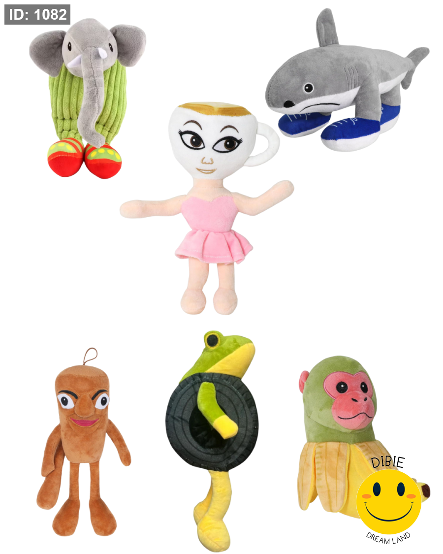 🧸 شخصيات متنوعة مثل: فيل، سمكة قرش، دمية فتاة صغيرة، وشخصيات كرتونية أخرى
