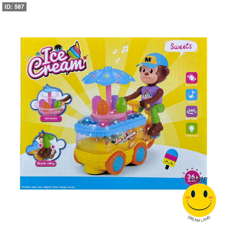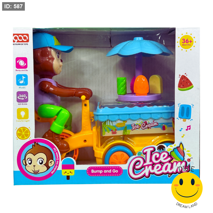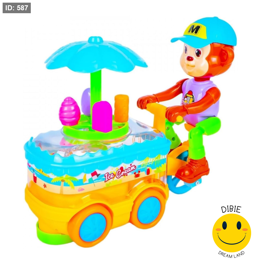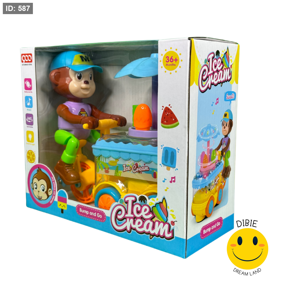 دع طفلك يستمتع بلعبة مليئة بالمرح والتفاعل مع قرد ظريف يقود دراجة بيع الآيس كريم المضيئة! 🚲🍧