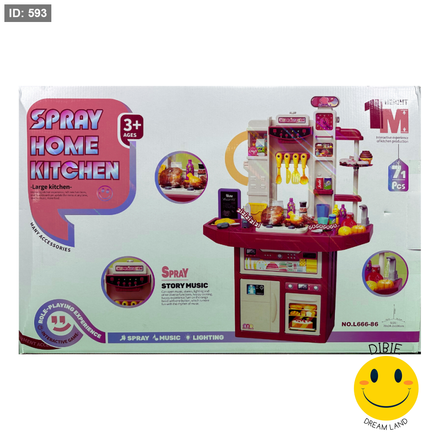 أجمل هدية للأطفال بعمر 3 سنوات فما فوق! مطبخ متكامل بتصميم واقعي، يحتوي على 71 قطعة متنوعة تشمل الأواني، الأطعمة البلاستيكية، الأدوات، والعديد من الإكسسوارات. يتميز بخاصية البخار (Spray) التي تحاكي الطبخ الحقيقي، بالإضافة إلى الموسيقى والإضاءة لجو أكثر متعة.