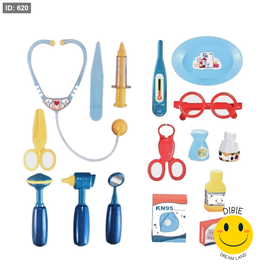 تحتوي على مجموعة أدوات دكتور (سماعة، مقص، حقنة، ميزان حرارة، نظارات طبية، زجاجات دواء).