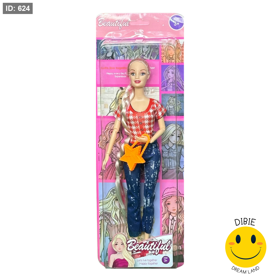 دمية أنيقة بملابس كاجوال عصرية 👕👖، لابسة بلوزة حمراء مربعات مع جينز أزرق مودرن، ومعاها شنطة على شكل نجمة ⭐ برّاقة بتكمل أناقتها.