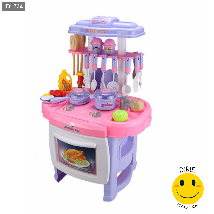 مطبخ متكامل بألوان زهرية جميلة، فيه أدوات مطبخ واقعية، أضواء موسيقية، وفرن يشتغل فعلاً 🔥🎶