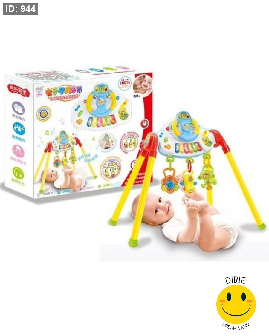 يحتوي على لوحة موسيقية وألعاب معلّقة ملوّنة تساعد على تنمية الحواس وتشجّع الطفل على الحركة والاستكشاف.